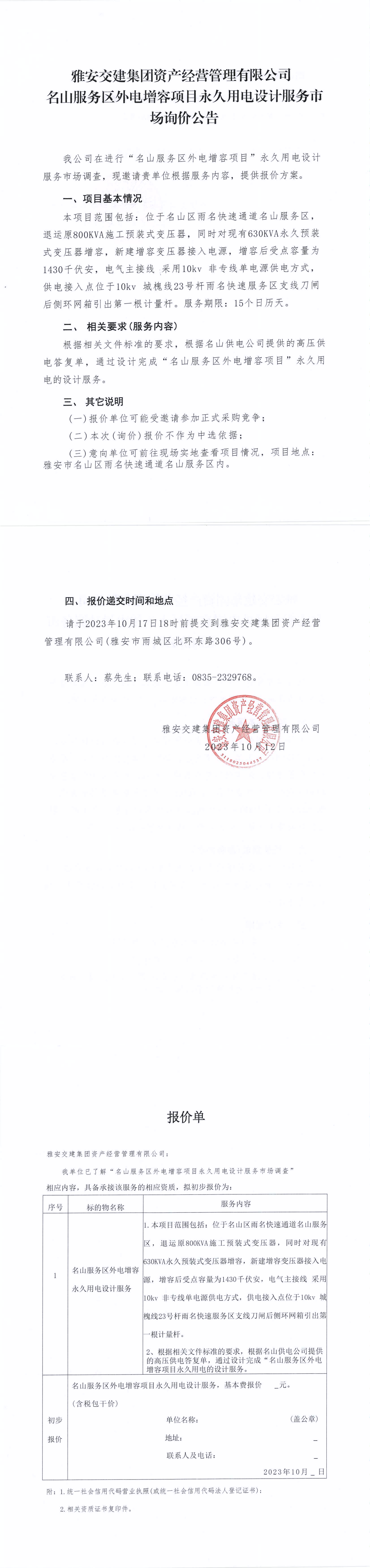 雅安交建集團(tuán)資產(chǎn)經(jīng)營管理有限公司名山服務(wù)區(qū)外電增容項(xiàng)目永久用電設(shè)計(jì)服務(wù)市場(chǎng)詢價(jià)公告
