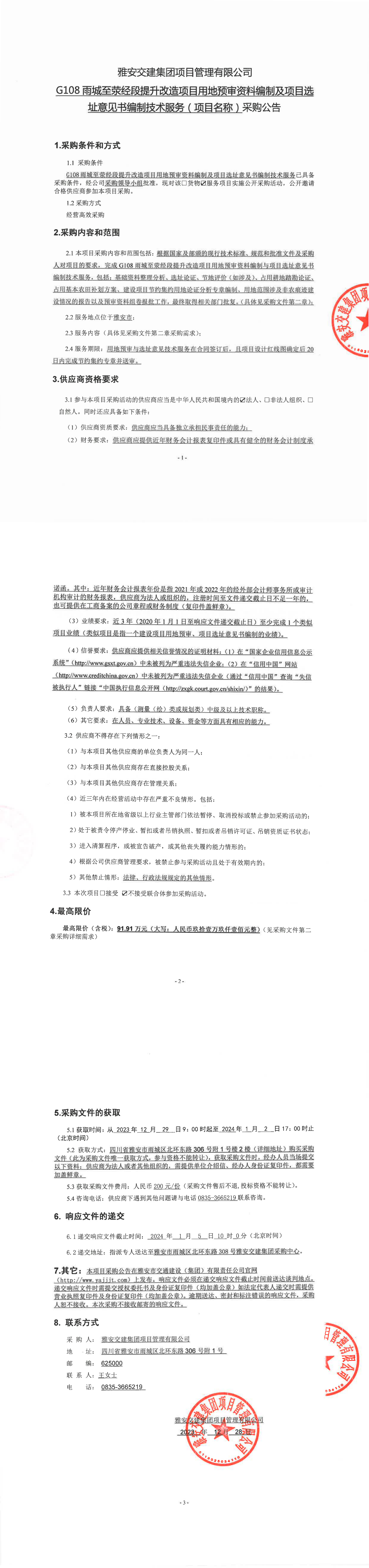 雅安交建集團項目管理有限公司G108雨城至滎經(jīng)段提升改造項目用地預審資料編制及項目選址意見書編制技術(shù)服務(項目名稱)采購公告
