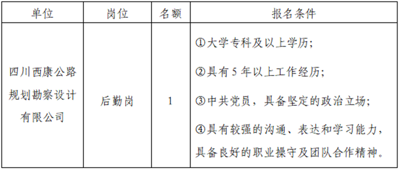 根據(jù)發(fā)展需要,決定面向社會(huì)公開(kāi)招聘雅安市交通建設(shè)(集團(tuán))有限責(zé)任公司(以下簡(jiǎn)稱(chēng)“雅安交建集團(tuán)”)所屬子公司綜合辦公室后勤崗1名,現(xiàn)將有關(guān)事項(xiàng)公告如下: