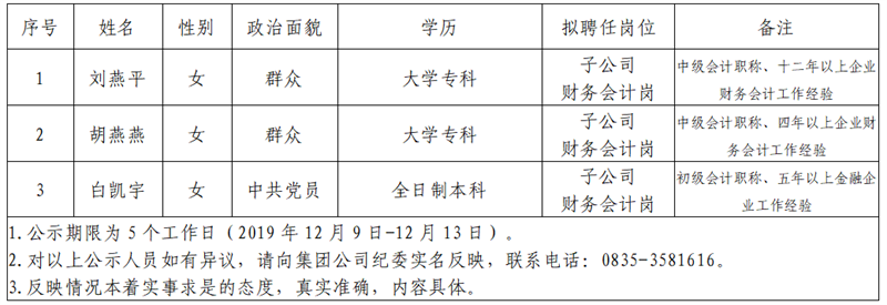 根據(jù)雅安市交通建設(shè)(集團)有限責任公司招聘公告,經(jīng)公開報名、資格初審、筆試、面試、等環(huán)節(jié),現(xiàn)將以下3名擬聘用人員予以公示: