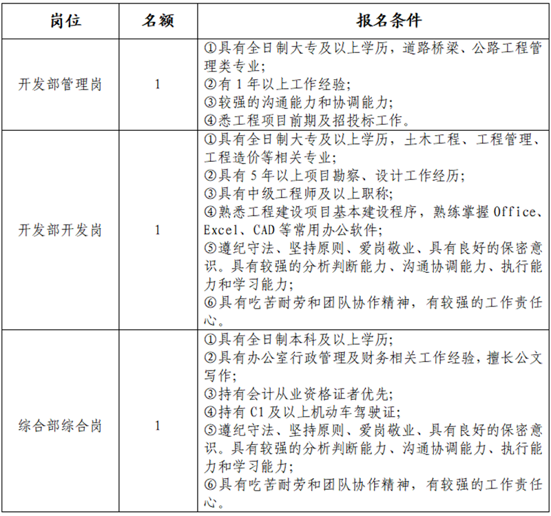 雅安交建集團(tuán)大興交通開發(fā)有限公司是雅安市重點(diǎn)國有企業(yè)雅安市交建集團(tuán)下屬子公司,主要從事交通基礎(chǔ)設(shè)施及服務(wù)設(shè)施投資、建設(shè)開發(fā);土地整理;房地產(chǎn)開發(fā);建筑材料生產(chǎn)、銷售;旅游開發(fā)等業(yè)務(wù)。根據(jù)公司發(fā)展需要,決定面向社會(huì)公開招聘3名工作人員,現(xiàn)將有關(guān)事項(xiàng)公告如下: