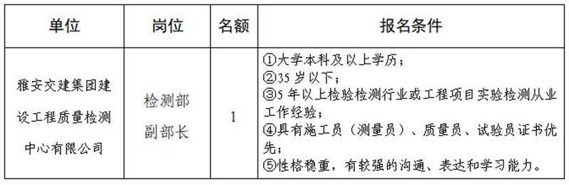 雅安交建集團(tuán)關(guān)于公開招聘所屬子公司工作人員的公告(工程檢測(cè)中心)