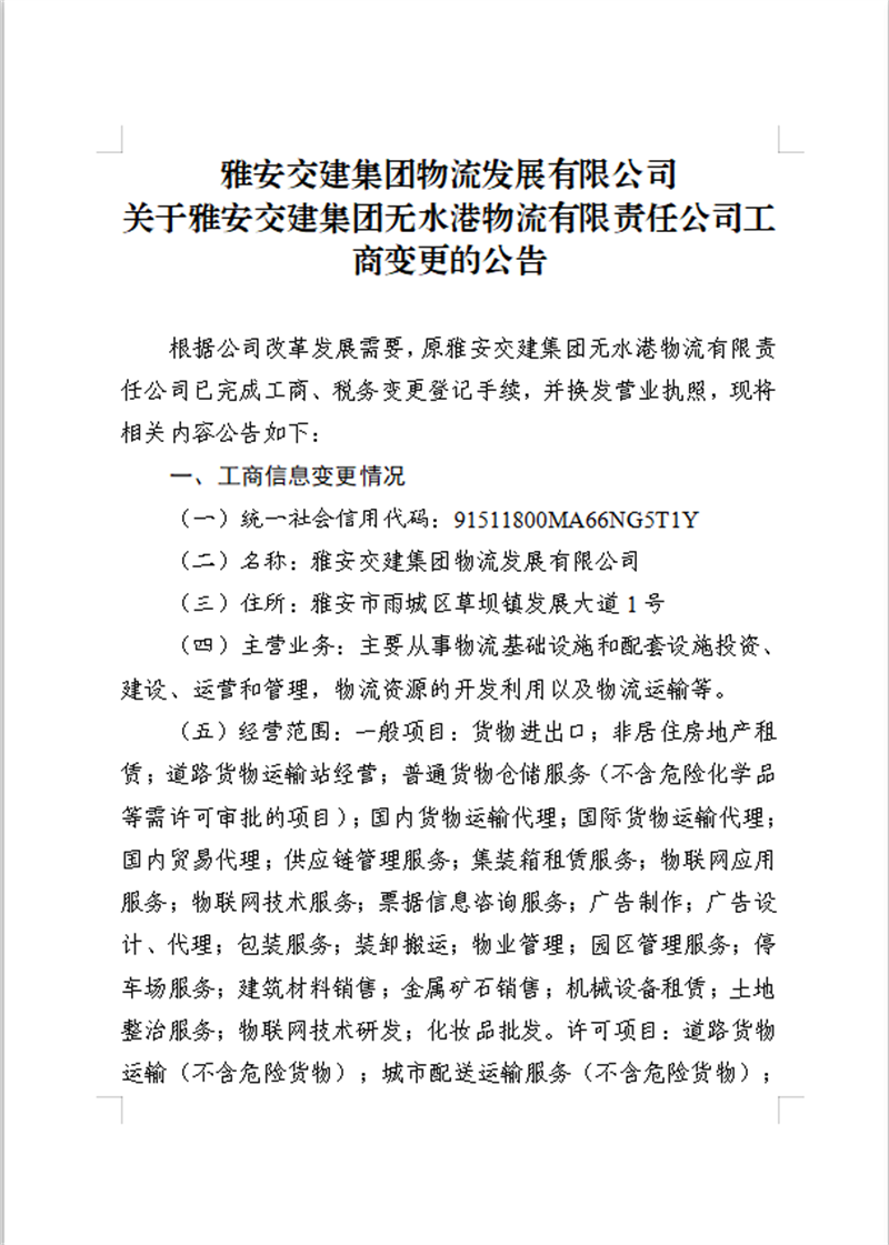 雅安交建集團物流發(fā)展有限公司關于雅安交建集團無水港物流有限責任公司工商變更的公告