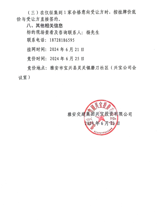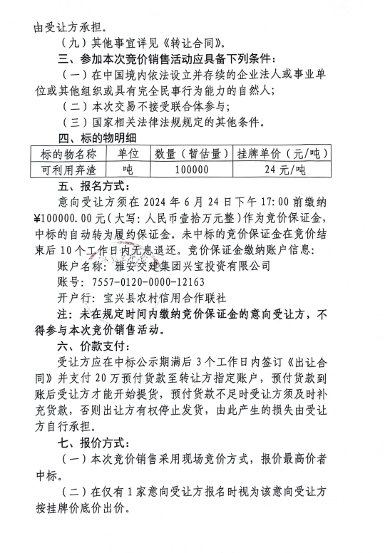 雅安交建集團興寶投資有限公司寶興縣靈關鎮(zhèn)代碑寺土地整理項目10萬噸可利用棄渣競價銷售公告(2024.6.21)