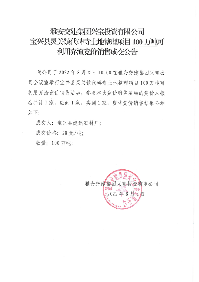 代碑寺土地整理項目10萬噸可利用棄渣競價銷售成交公告