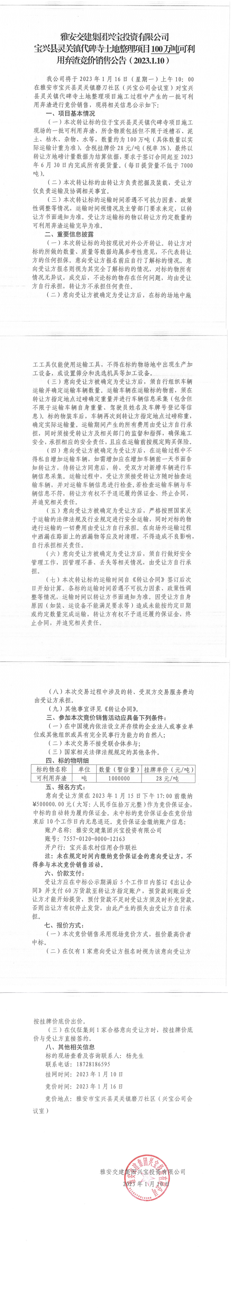 雅安交建集團(tuán)興寶投資有限公司靈關(guān)鎮(zhèn)代碑寺土地整理項(xiàng)目100萬噸可利用棄渣競價(jià)銷售公告(2023.1.10)